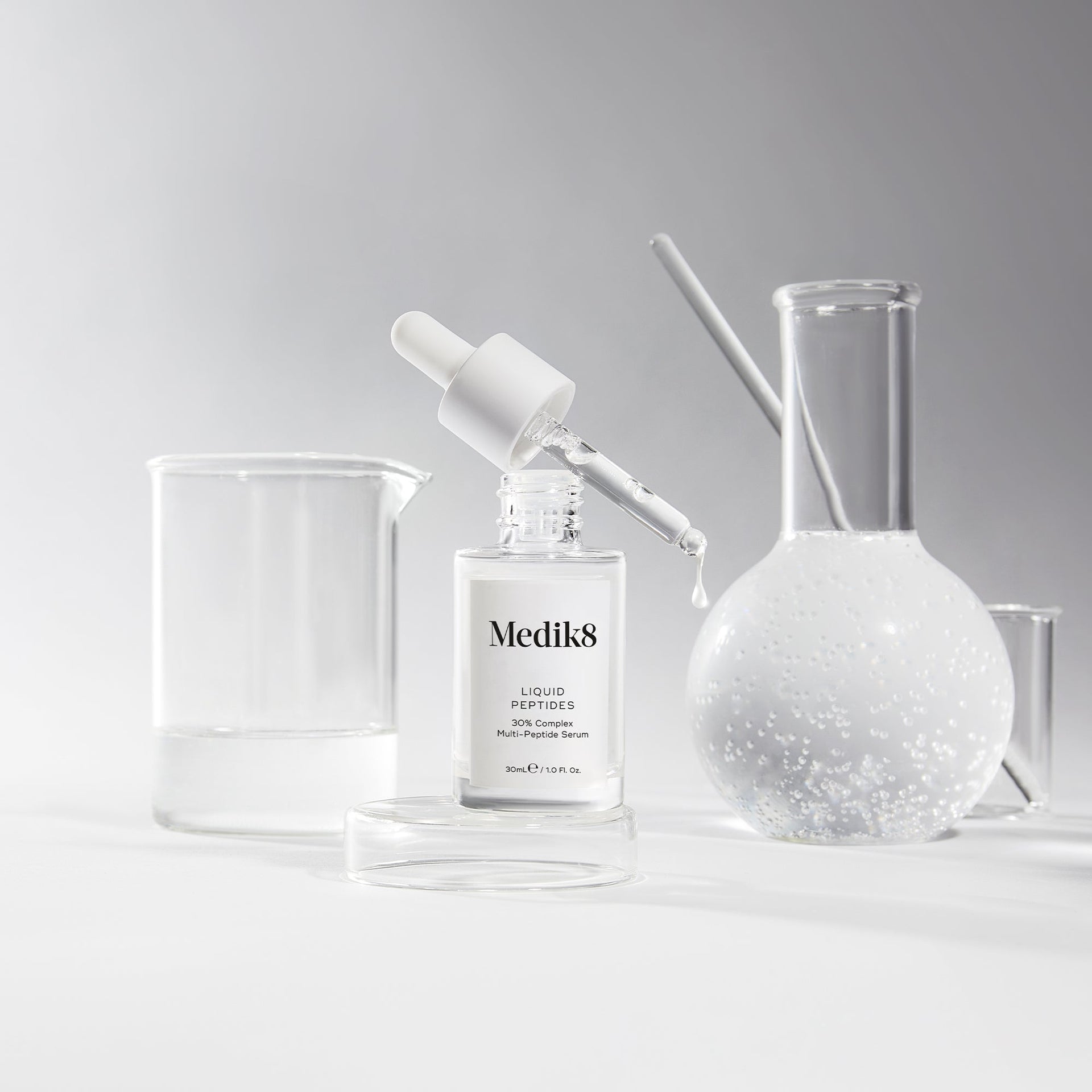 Keďže rôzne kombinácie peptidov ponúkajú nekonečné možnosti v boji proti starnutiu (a robia pre pleť oveľa viac než len podporu produkcie kolagénu), Medik8 posunul tradičnú technológiu peptidov na novú úroveň s Liquid Peptides. Toto krištáľovo čisté sérum obsahuje 10 jedinečných peptidov (starostlivo vybraný súbor našich obľúbených) a využíva priekopnícky systém dronového zacielenia, ktorý zabezpečuje, že každý účinný peptid prenikne hlboko do pleti – presne tam, kde je najviac potrebný – aby mohol pôsobiť svojím omladzujúcim efektom. Naše vybrané peptidy pracujú naprieč viacerými procesmi v pleti a prinášajú viditeľné výsledky v redukcii jemných liniek, vrások a zlepšení objemu pleti. Toto peptidové sérum s funkciou bunkovej signalizácie pomáha nielen spomaľovať, ale aj predchádzať vzniku mimických liniek a hlbokých vrások. Jeho 30 % peptidová zmes zároveň okamžite hydratuje pleť, vďaka čomu je tento multifunkčný peptidový koktail ideálnou voľbou pre starnúcu, suchú a dehydratovanú pleť.