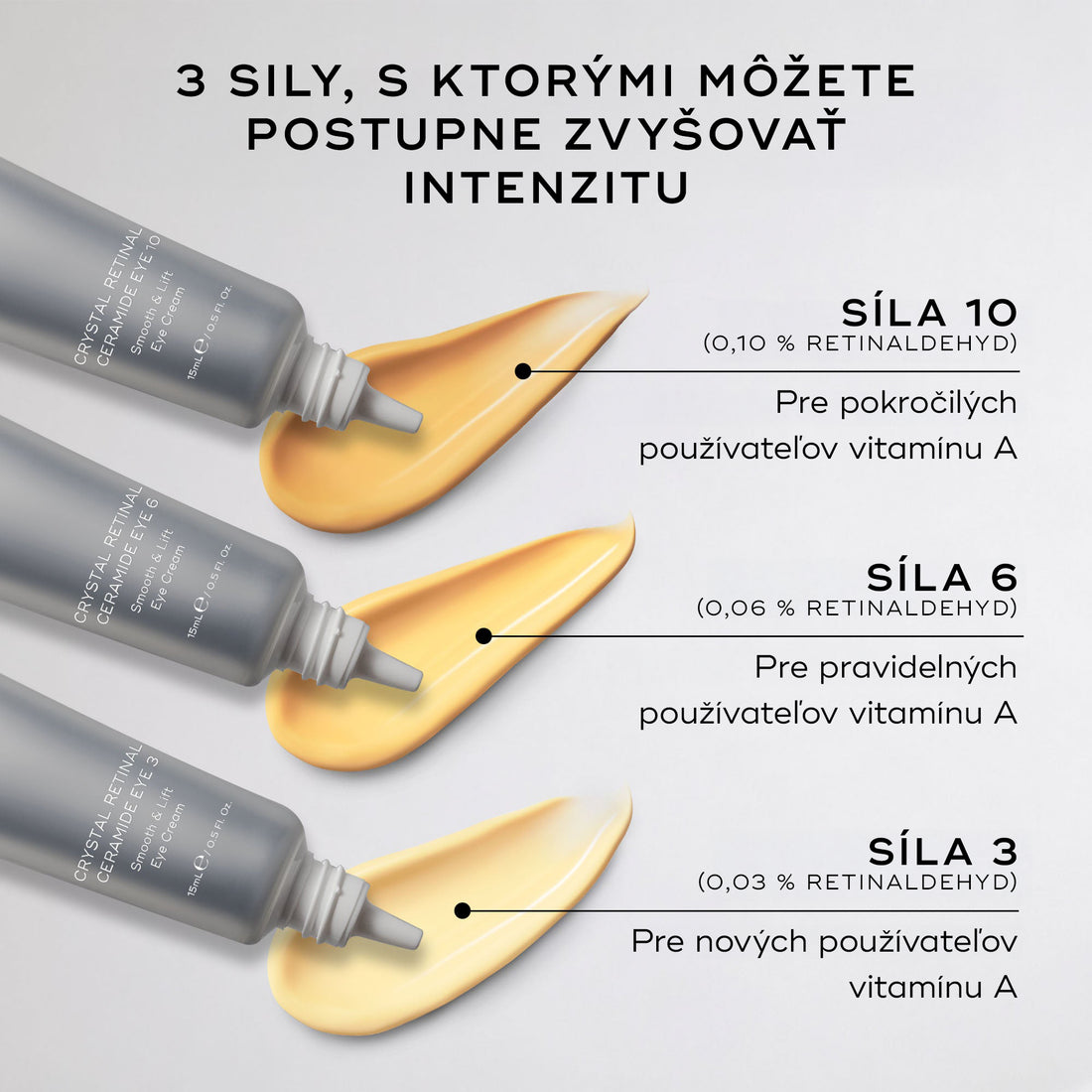 Nájdite svoju ideálnu verziu. Crystal Retinal Ceramide Eye je k dispozícii v sérii 3 progresívnych koncentrácií retinalu, ktoré vám umožnia zvyšovať výsledky, keď budete pripravení (0,03% - 0,1% retinal). Naša najnižšia sila (3) je navrhnutá pre veľmi citlivú pleť alebo pre tých, ktorí sú noví vo využívaní vitamínu A, zatiaľ čo vyššie koncentrácie poskytujú skúsenejším používateľom vitamínu A príležitosť zintenzívniť výsledky v priebehu času. S Crystal Retinal Ceramide Eye sme do kategórie retinalov pre oči zaviedli progresívne výsledky - aby sa vaše výsledky vždy zlepšovali, nikdy neprestali zlepšovať.