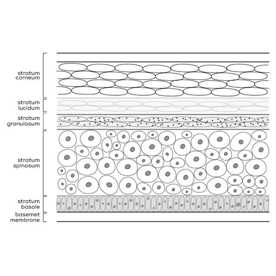 Epidermis je horná vrstva pokožky. Ďalej je rozdelená na 5 rôznych vrstiev, z ktorých každá má svoje vlastné špecifické vlastnosti a funkcie. Kožné bunky sa vytvárajú v najnižších vrstvách nazývaných stratum basale. Tu sa bunky rýchlo replikujú, pretože stále obsahujú jadro, ktoré uchováva DNA. Melanocyty, bunky, ktoré vytvárajú melanín a dávajú pleti farbu, sa nachádzajú aj v tejto vrstve. Kožné bunky v stratum basale sa posúvajú nahor cez vrstvy epidermy smerom k povrchu, pričom prechádzajú jemnými zmenami v každej fáze. V horných vrstvách bunky strácajú svoje jadro a stávajú sa plochými, mŕtvymi kožnými bunkami nazývanými keratinocyty. Tieto sa neustále olupujú a odhaľujú novšie, čerstvejšie bunky pod nimi.