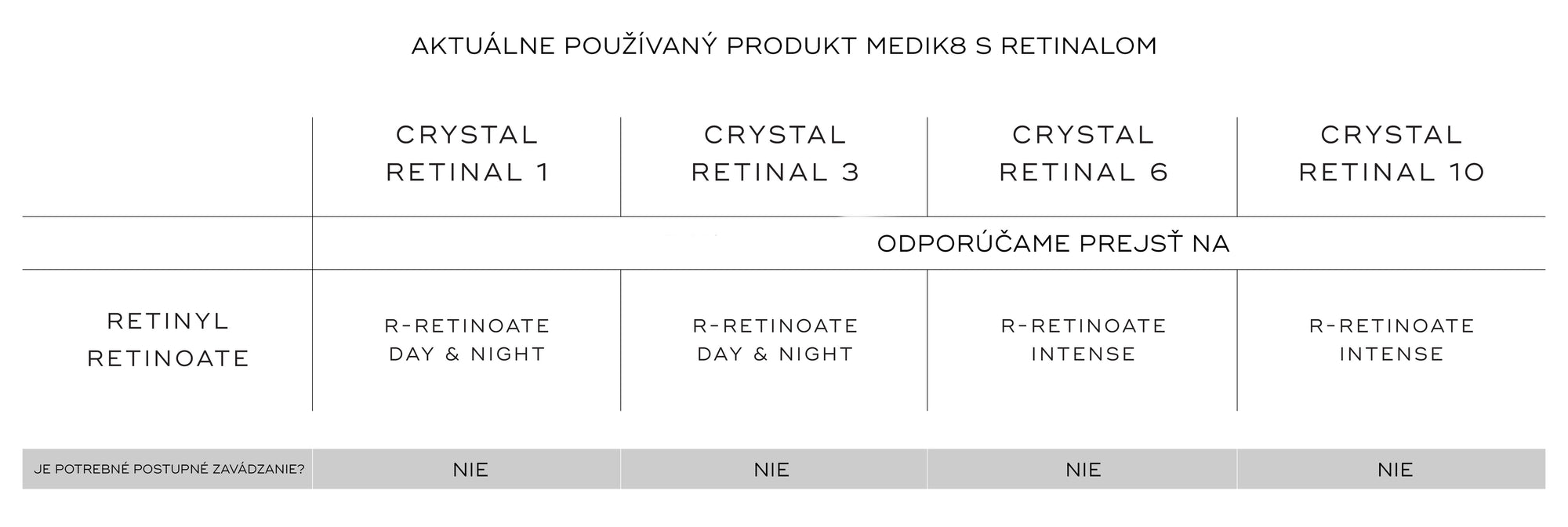 Poznámka: Pri prechode z Crystal Retinal na našu líniu r-Retinoate nie je potrebné fázu zavádzania dodržiavať.
